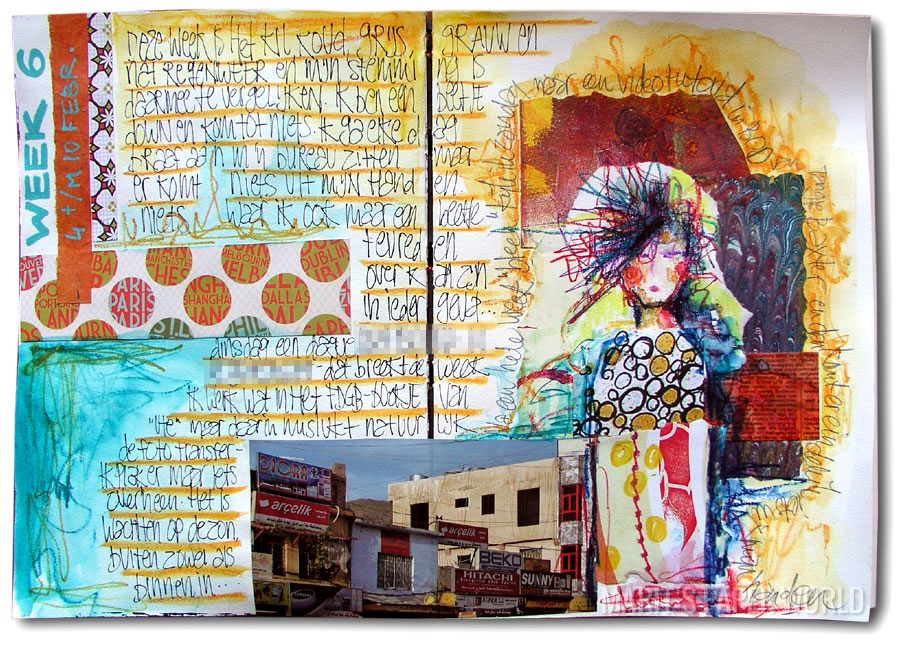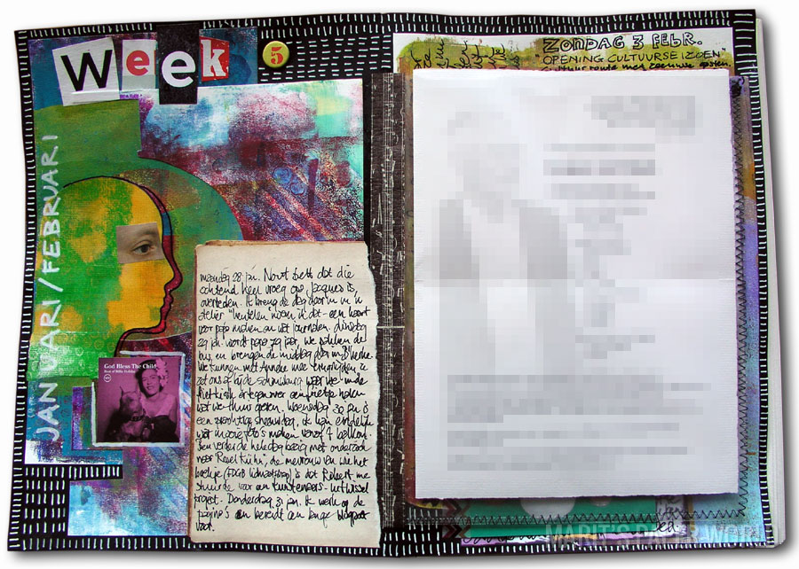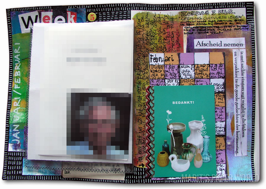 I did show up in my atelier every day, and managed to create a weekly spread on that empty page… I added a plastic pocket to the pages to preserve the funeral- and memory card (the blurred part)