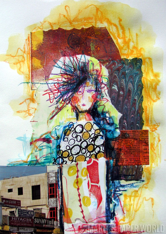 Last weekend, I watched the video-tutorial my fellow-teacher Tangie Baxter posted in the workshop “Book of Days” and lo and behold ~ grey clouds seem to disappear and I spend all day drawing faces and tearing & pasting pieces of paper. This is what came out of my hand… not my normal style but it was fun and I felt a lot better!