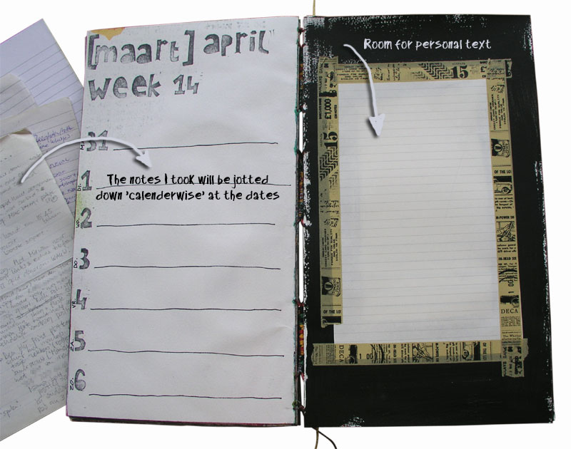 These pages all look the same… on the left I created a ‘calendar’ kind of page – to write down the facts with each date – and on the right I glued lined paper to write my personal story about this period in my life (“old fashioned private and personal diary-writing”.)