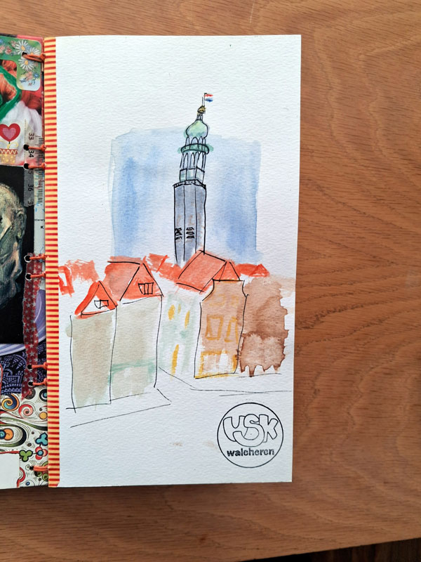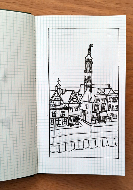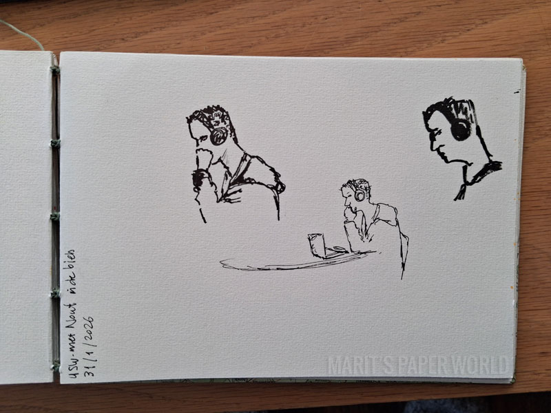 In my region there is an active Urban Sketching Group that organizes monthly events. I know the founders and I taught a Leporello- workshop to a group of sketchers last september but only once joined a Sketchers-event (back in 2023, see this blogpost.) Last month however, I noticed the next sketching event would be in the library in my town and I informed my son about it. Wouldn’t it be nice if he would come over and we would go sketch together? He was enthousiastic about it too and so he came to visit us and we went to go sketch together.