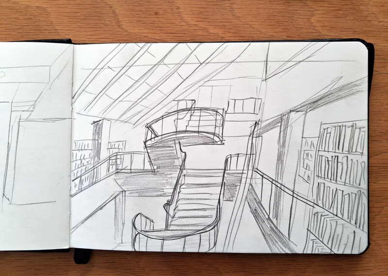A lot of sketchers (almost 20) gathered in the library and then spread out over different parts of the building to start drawing. I didn’t stay in one place but found different spots to draw. Here are my sketches
