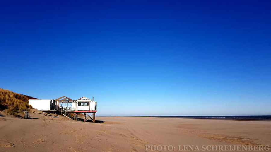 | Het strand weids en stil Alleen het oorverdovend ruisen van de zee | The beach wide open Only the deafening roar of the breaking waves |