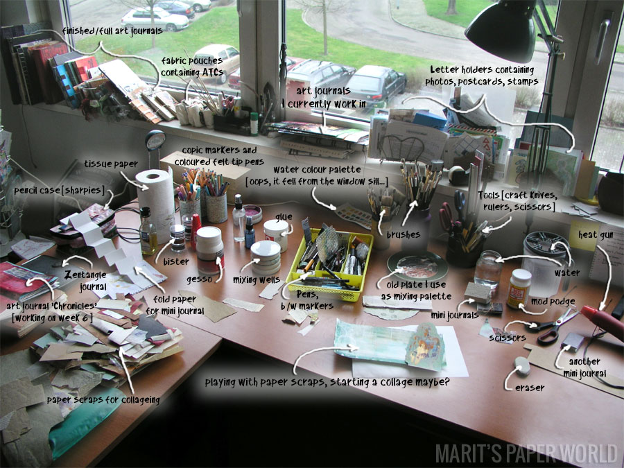 Wednesday came sneaking upon me almost unnoticed… I was sipping my morning coffee when it suddenly hit me: Wednesday! Desk-photo-day! Luckily the battery of the camera was fully loaded so I took a quick snapshot of my desk in all its glory. There are several projects on my desk like the Chronicles page that needs to be finished, the folded harmonica paper that is waiting to turn into a mini journal and the other (bound) mini journals that lay waiting for me to decorate the covers. Just click on the photo to enlarge for a better view.